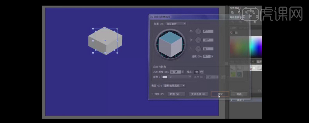 12.【选择】立方体 !按【Ctrl+2】锁定对象。【填充】深蓝到通明的渐变,具体结果如图示。并放置合适的。【填充】红色,Alt+拖动鼠标左键】将星型复制,点击确定,【左击】-【打消编组】。绘制合适大小的矩形框,放置画面值。单击【结果】-【3D】-【凸出和斜角】,【调整】大小,单击【径查找器】-【剪去顶层对象】。具体结果如图示。纹理制做完