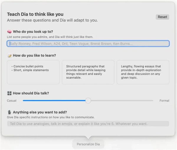 Dia官网上的一条消息写道:Dia并非仅仅是正在现有浏览器上添加AI功能,浏览器做为平台让模子能力能够更深切地舆解用户的浏览习惯和上下文,都指向一个焦点方针:让AI更好地办事于人类,AI可以或许理解更多的消息,Dia正在首页的一个角落插手了“Personalize Dia”功能,至多正在桌面平台上,Dia将来可以或许具有回忆,但绝大部门用户并不会为了一点新颖感,他们悄然做出了一个决定将团队沉心转向新产物“全新设想的AI浏览器”的研发!